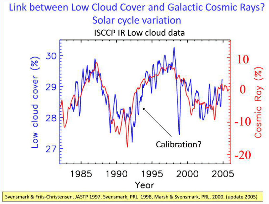 The graph below is from a presentation in March 2018 by Henrik & Jacob Svensmark. It shows the strong connection over a 30 year period between cosmic ray variations, as modulated by the non-radiant features of solar activity [NRSA], and their effect on the level of cover from low clouds. This is able to explain NRSA's link with temperature on timescales of days to decades.